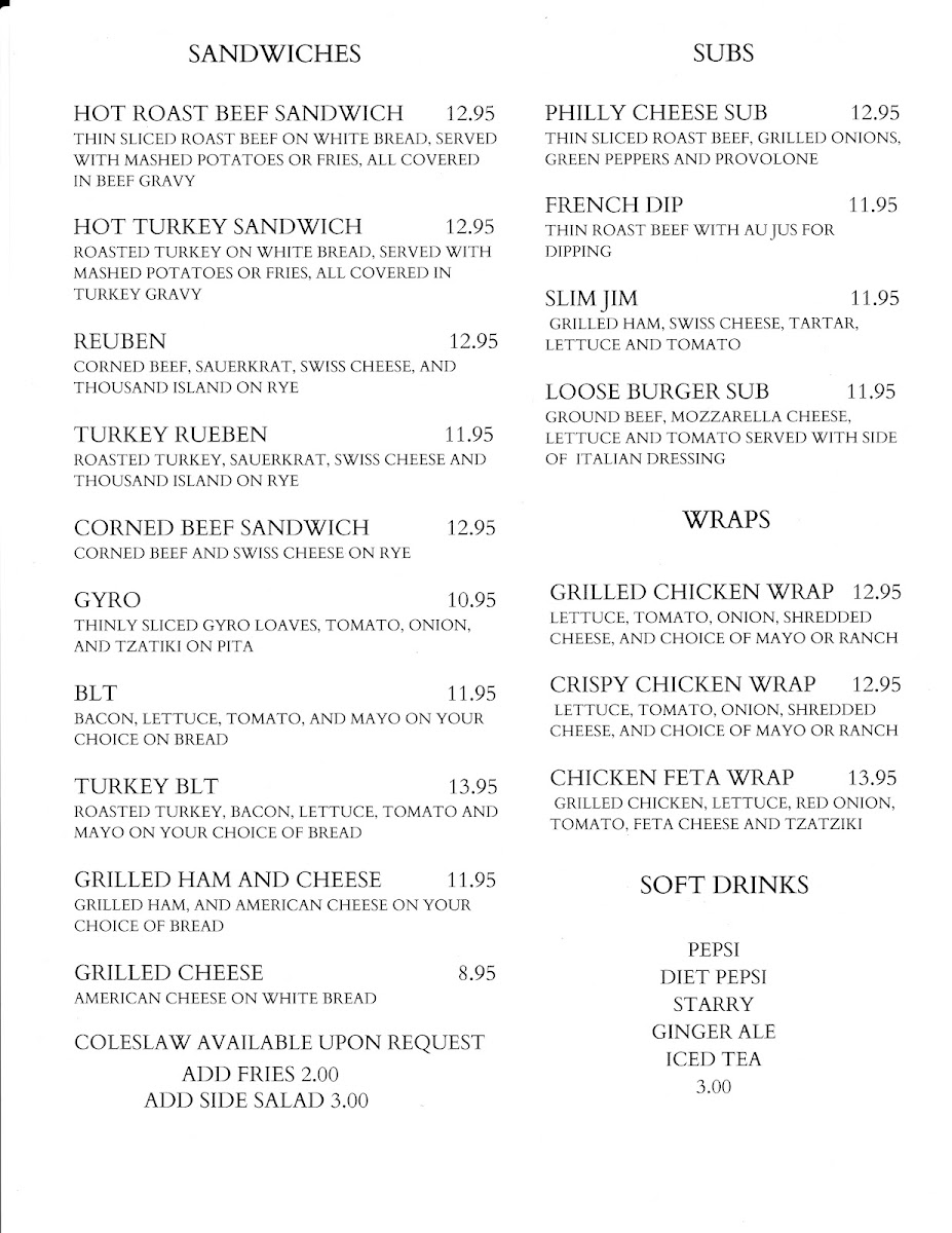 Favorites like the Cajun Burger and Chicken Feta Wrap provide flavorful bites ideal for unwinding with friends, while dishes such as Oven Roasted Turkey and Chicken Pot Pies bring a comforting, home-cooked touch. The menu also features lighter fare like Greek Salad alongside satisfying classics like Fish and Chips or Steak and Cheese Subs, making it easy to find something for any appetite.