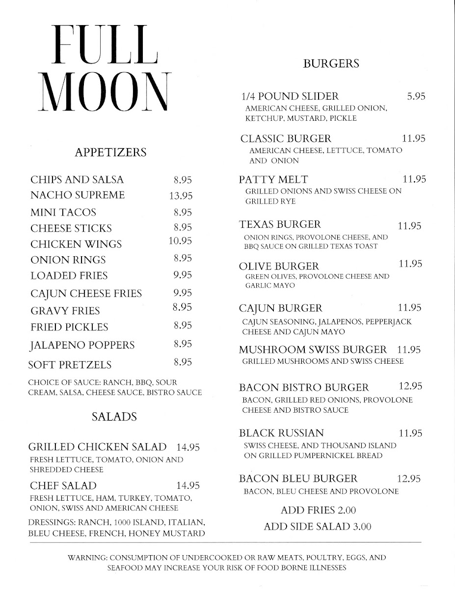 The menu at Full Moon Bar & Grill offers a relaxed mix of classic bar favorites and comforting meals that fit perfectly with its inviting local vibe. You’ll find a variety of satisfying options that cater to both casual get-togethers and relaxed dinners, from hearty burgers and wraps to savory sandwiches and homestyle dishes.